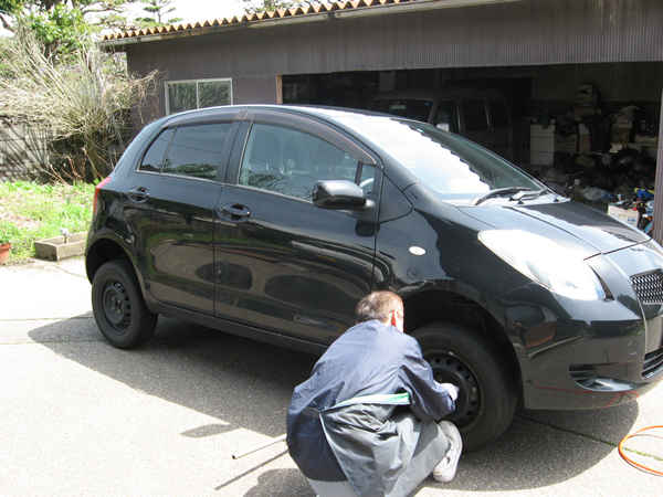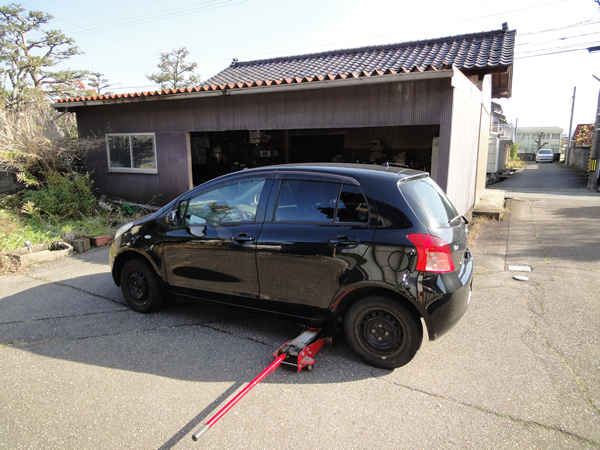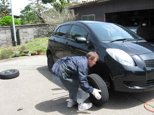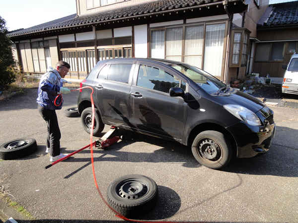 毎年 F 君の自宅の庭で、今年は早めにタイヤ交換をしてもらいました。