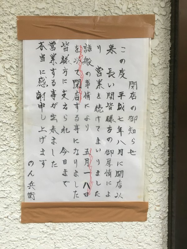 日で閉店されました。次の日の張り紙