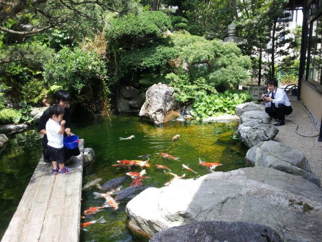 何組みかお客さんがおり、鯉の餌やりを子供たちがやらせてもらえ長男の